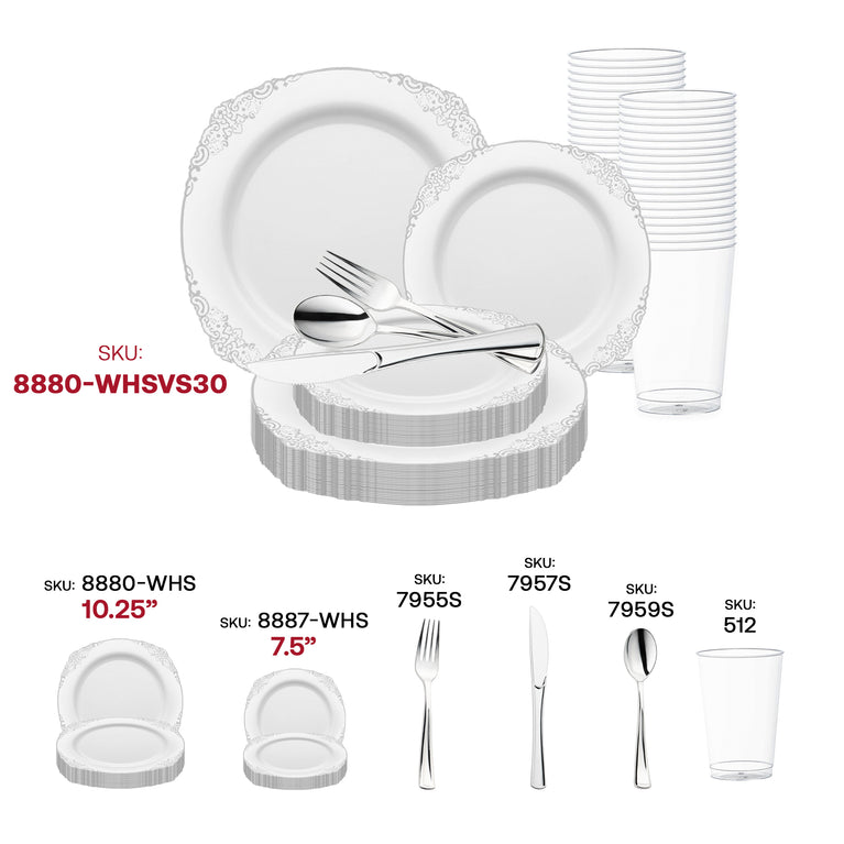 White with Silver Fancy Round Disposable Plastic Wedding Value Set