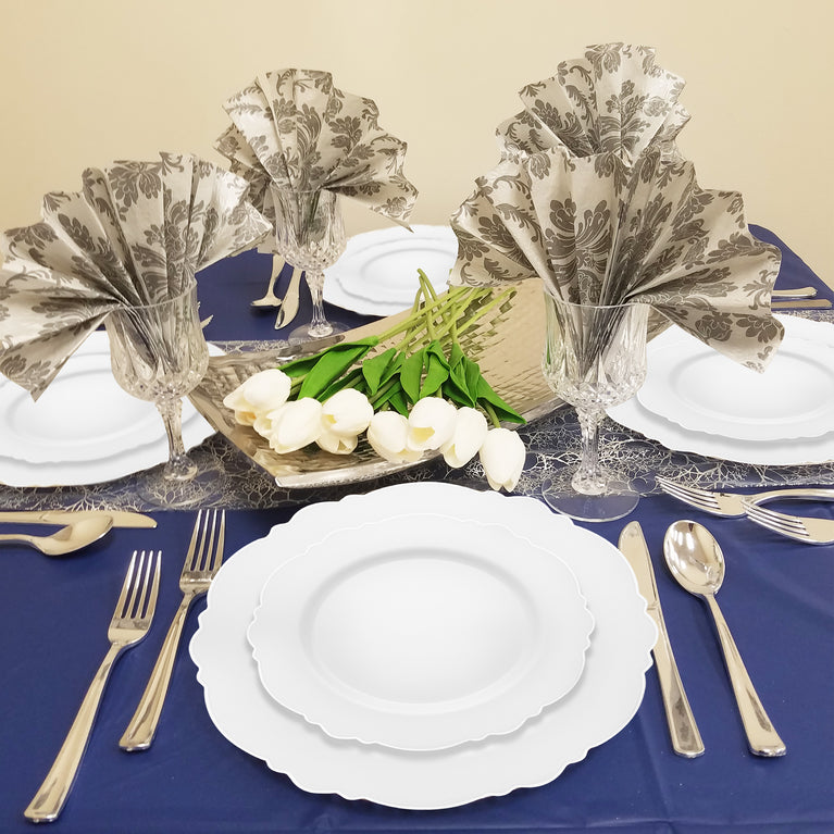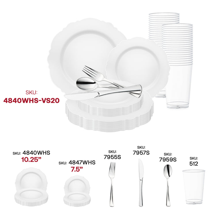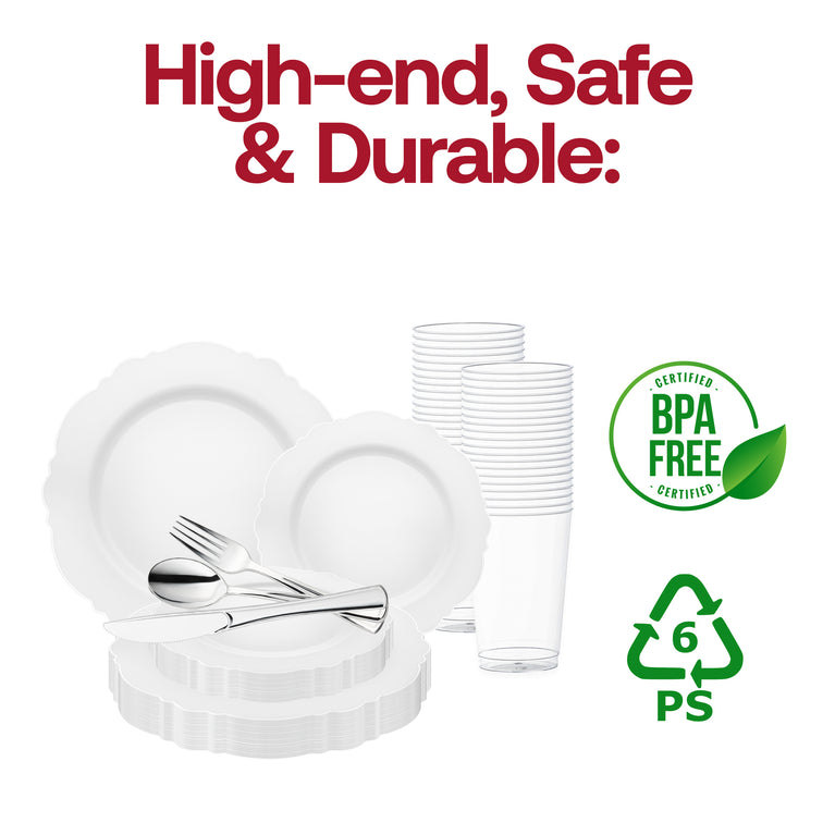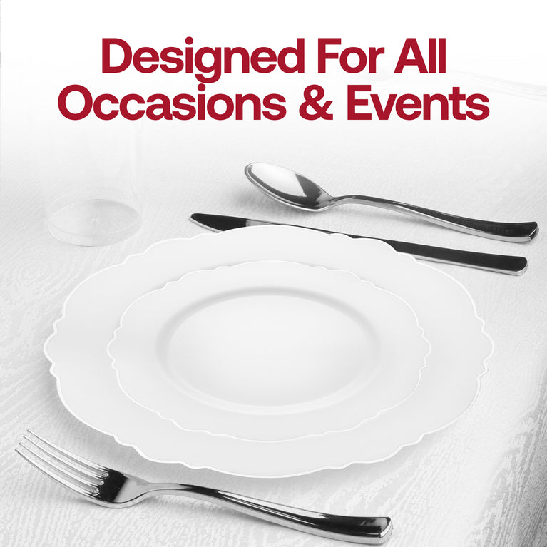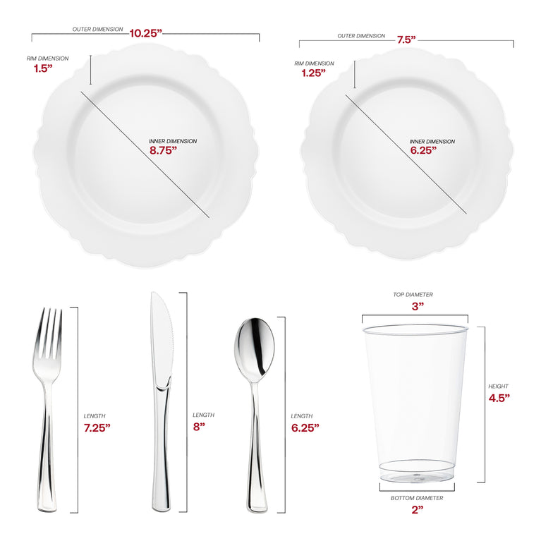 White with Silver Rim Round Blossom Disposable Plastic Wedding Value Set