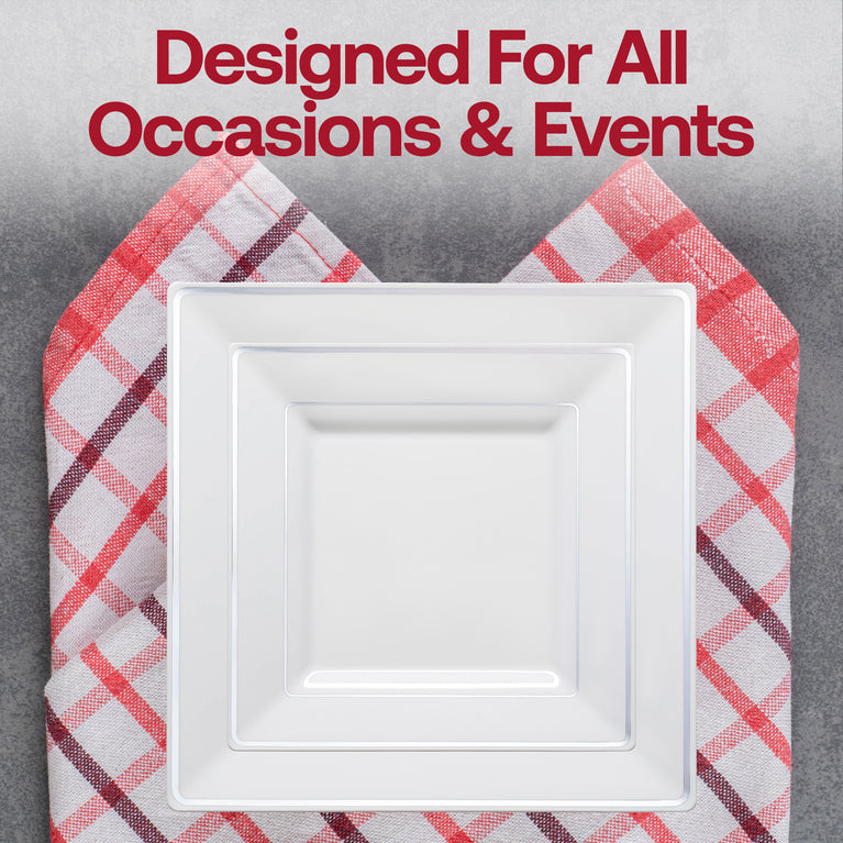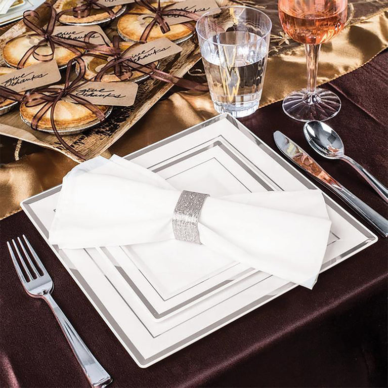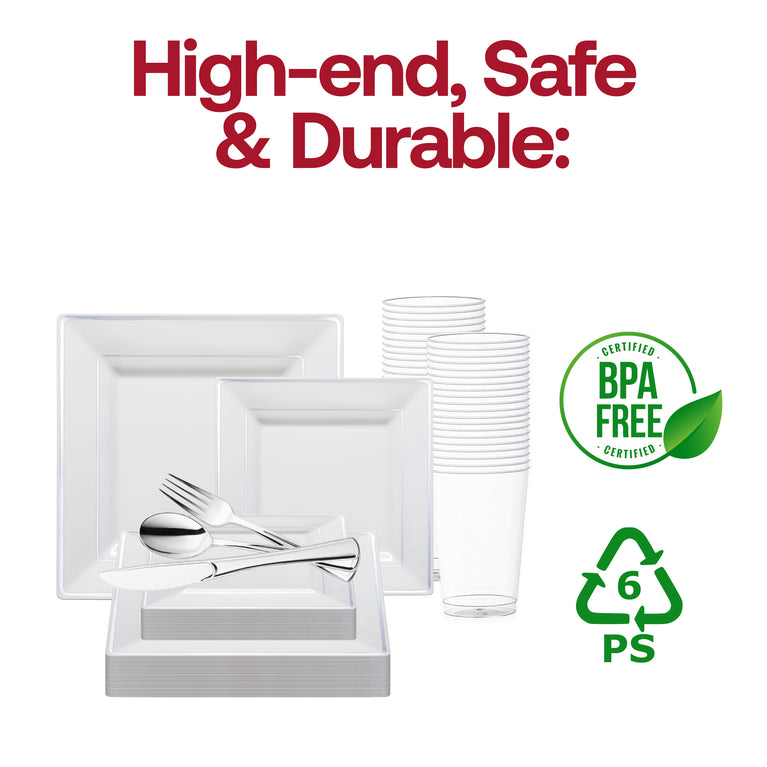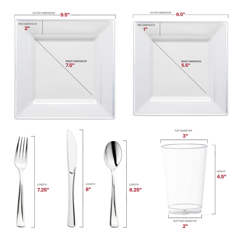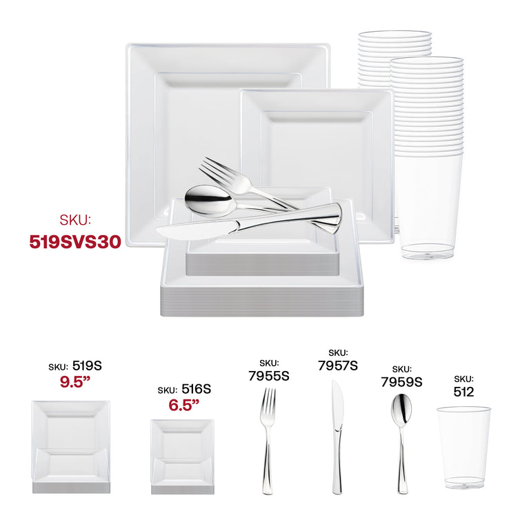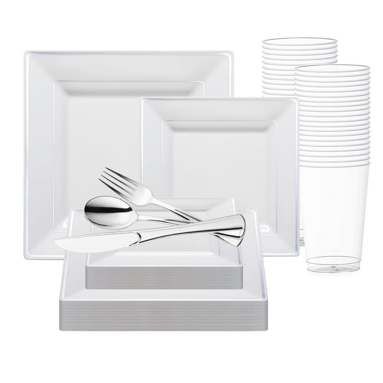 White with Silver Square Edge Rim Plastic Wedding Value Set