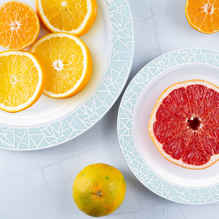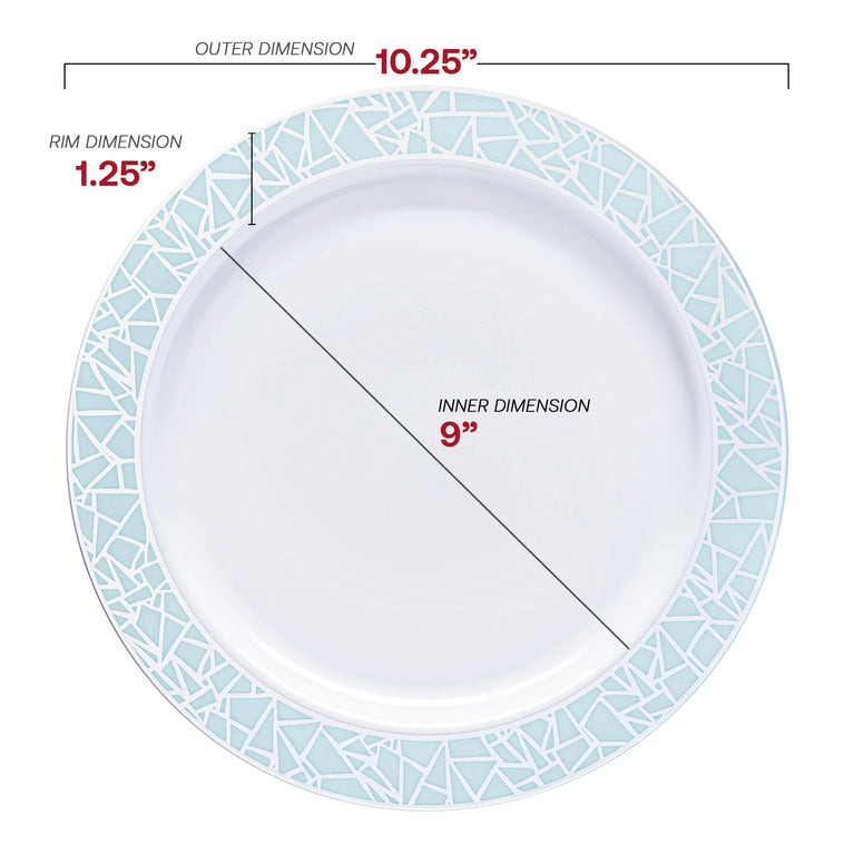- Product Name: White with Turquoise Blue and Silver Mosaic Rim Round Plastic Dinner Plates (10.25")