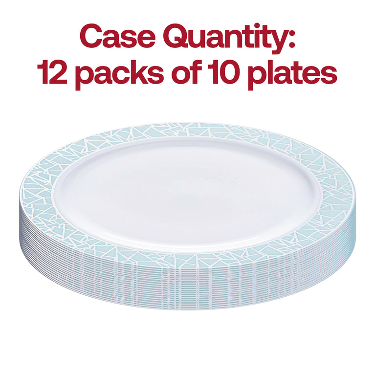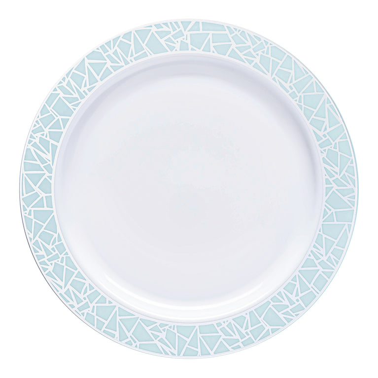 White with Turquoise Blue and Silver Mosaic Rim Round Plastic Dinner Plates (10.25")