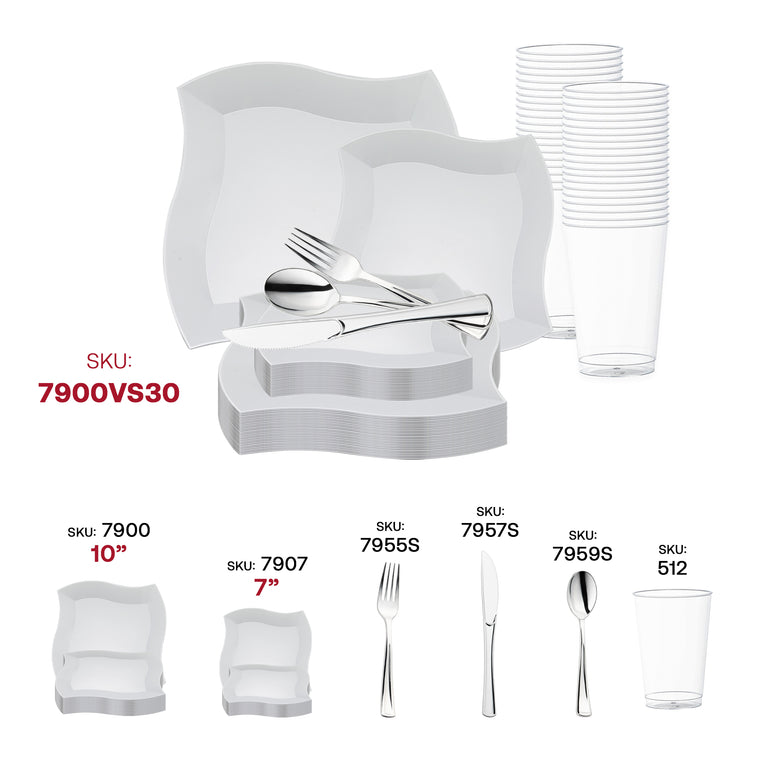 - Service for 30: 30 Dinner plates, 30 salad plates, 30 forks, 30 spoons, 30 knives and 30 12 oz. Tumblers