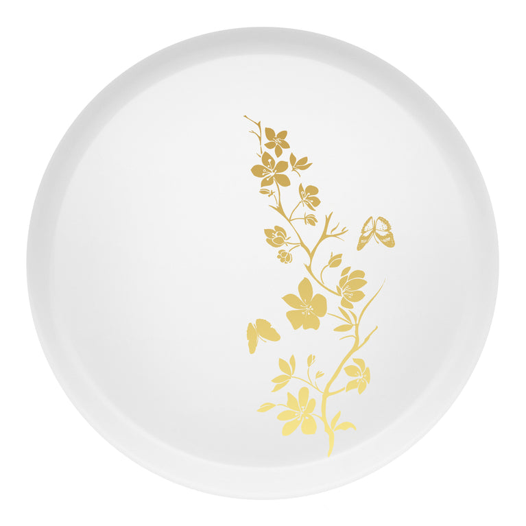 White with Gold Floral Rim: Elegant, photo-ready finish.