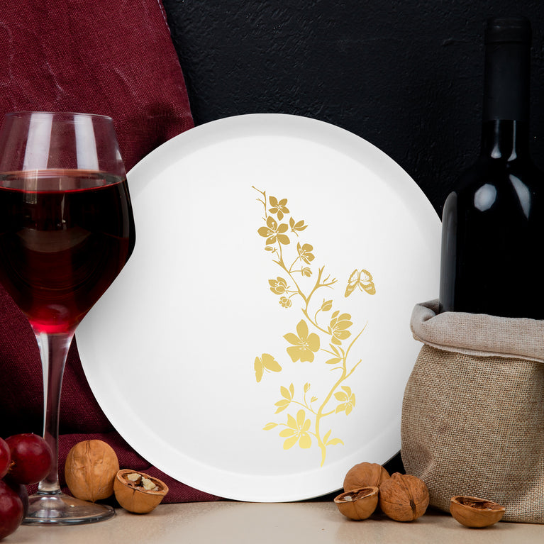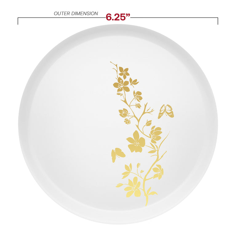 Elevate every sweet course with 6.25" white plastic pastry plates featuring a gold floral rim. Perfect for weddings, showers, birthdays, or corporate events, these plates balance upscale style with easy cleanup. Available in 10-count sleeves for small gatherings or 120-count cartons for larger events. Pair with matching tableware for a cohesive, photo-ready dessert table.