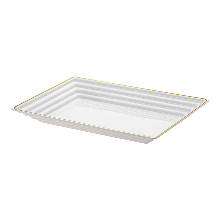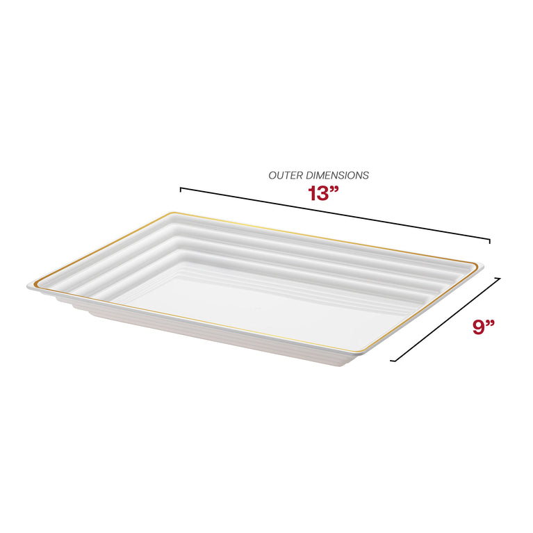 Serve appetizers, entrées, or desserts in style with our 9" × 13" White with Gold Rim Rectangular Plastic Serving Trays. Made from food‑safe, rigid plastic, they mirror fine china yet deliver the grab‑and‑go convenience of disposable party platters. The trays' crisp rectangular shape maximizes your plating space, giving you the flexibility to arrange food creatively. Plus, the raised rim is designed to keep sauces, crumbs, and other messes contained, ensuring your table remains tidy and elegant throughout your event.