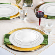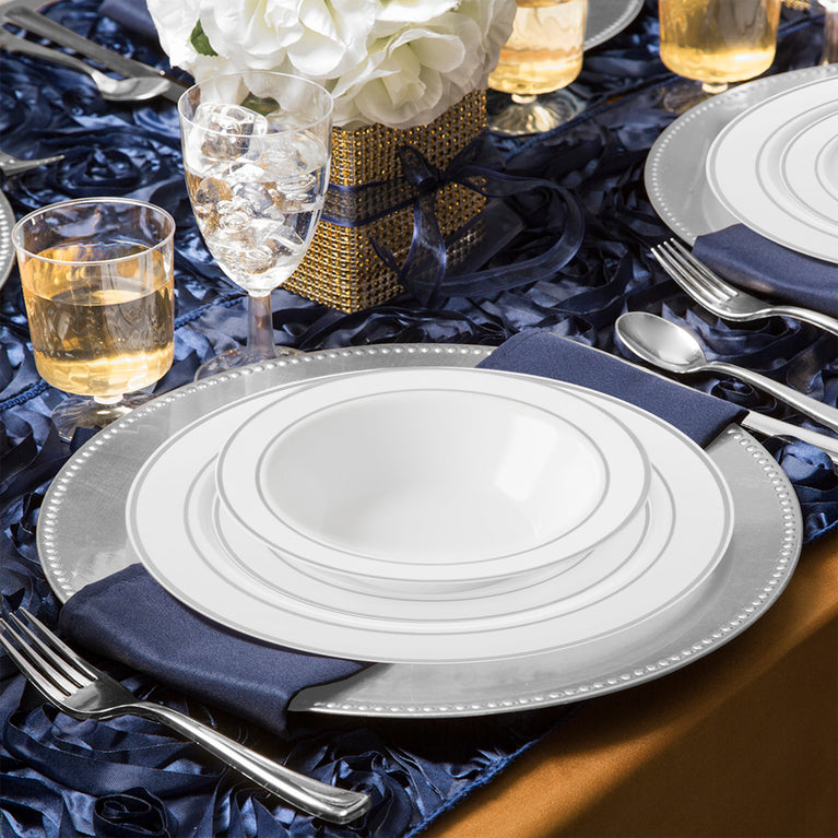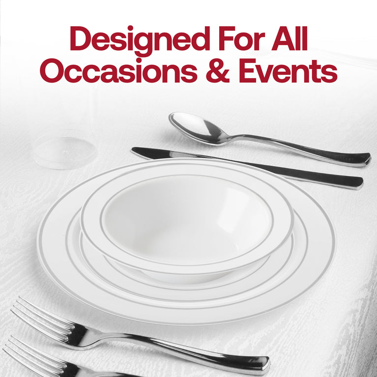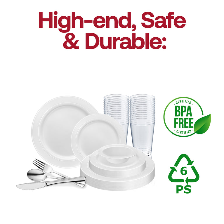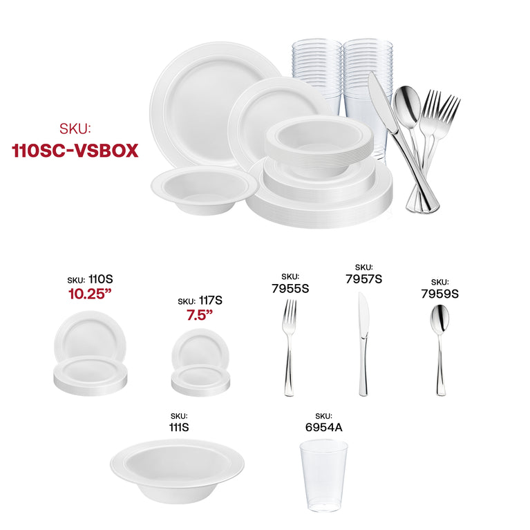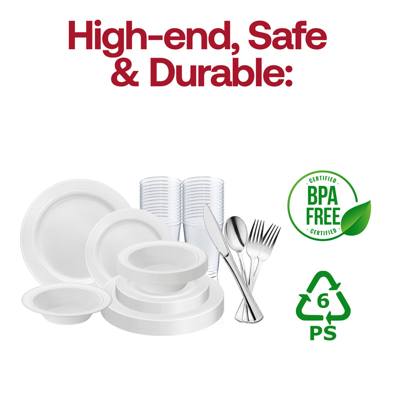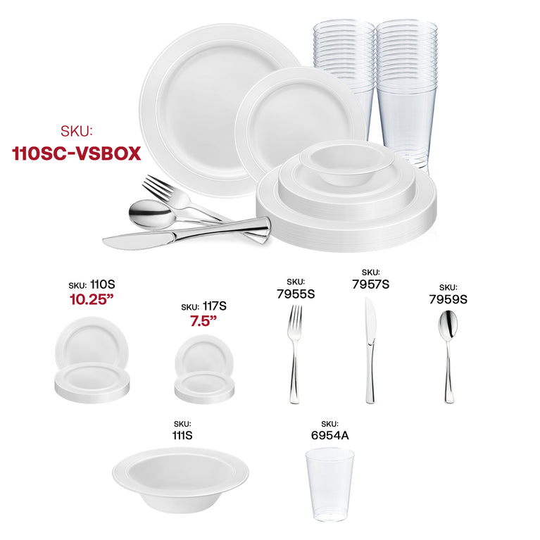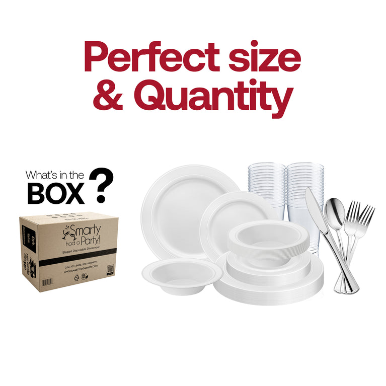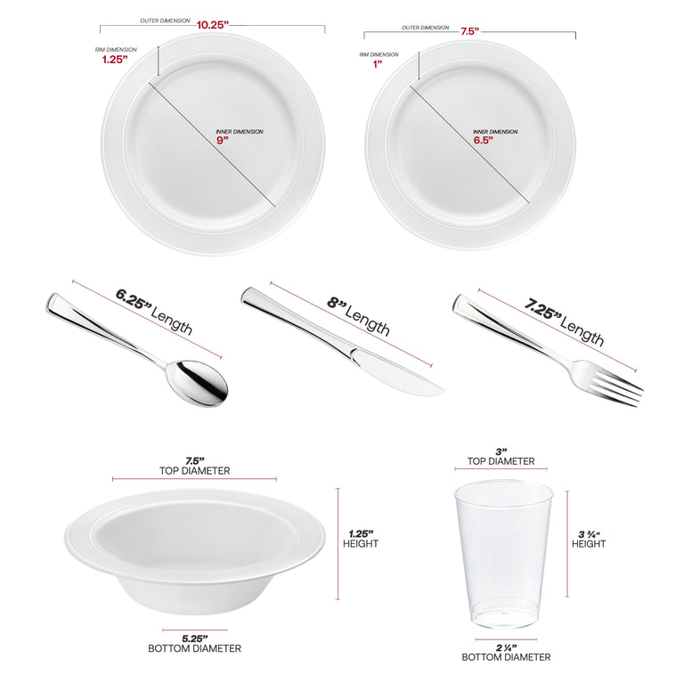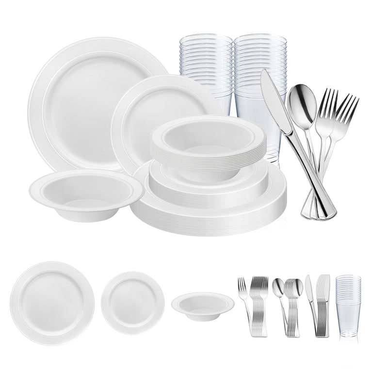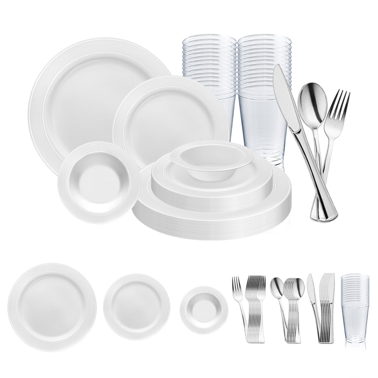 White with Silver Edge Rim Plastic Wedding Value Set - 120 Dinner Plates, 120 Salad Plates, 120 Bowls, 240 Forks, 120 Spoons, 120 Knives, 120 Cups