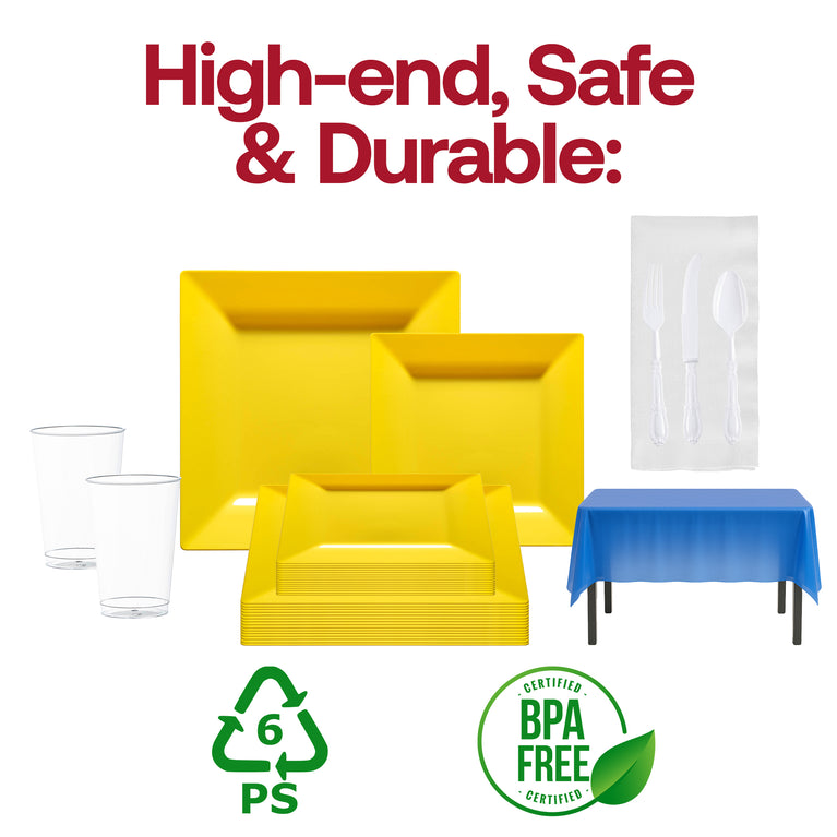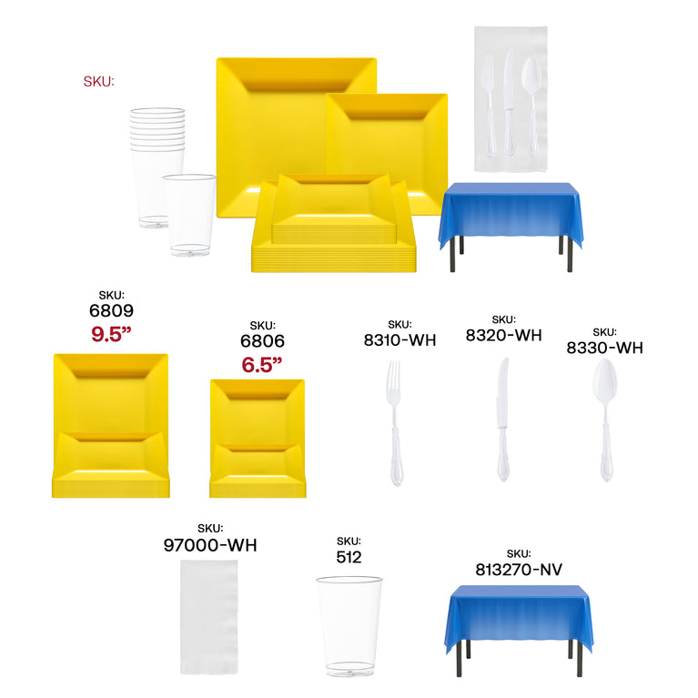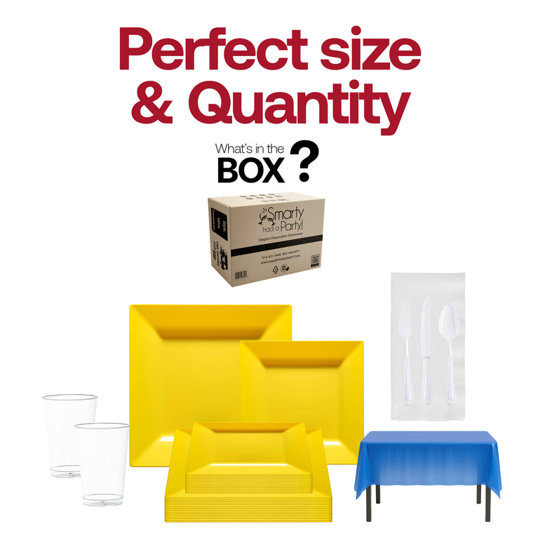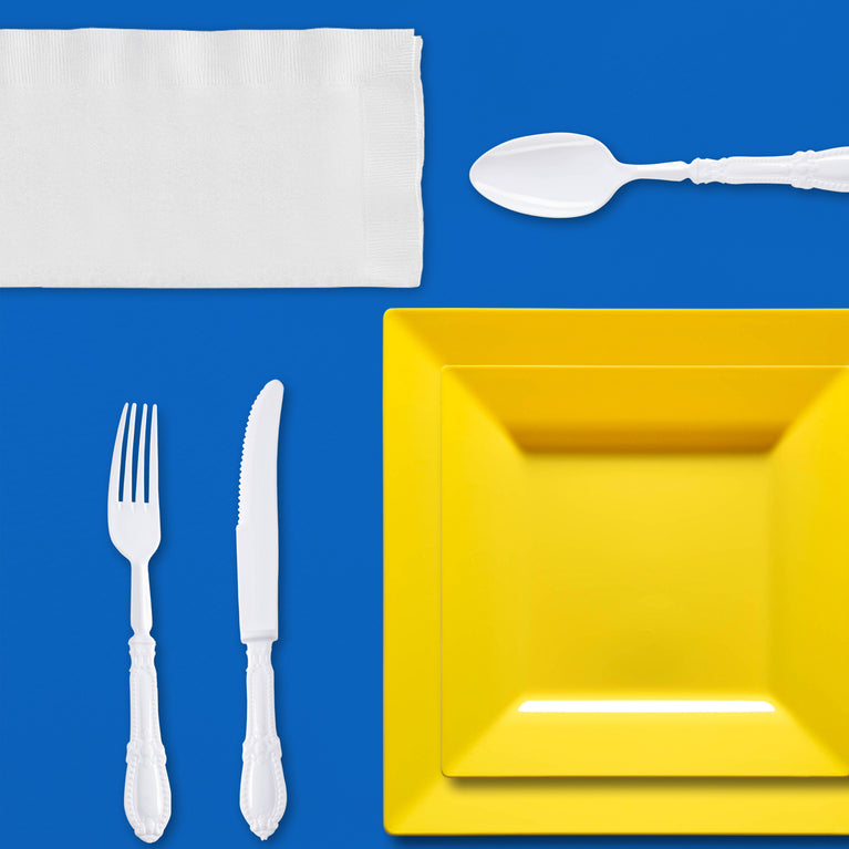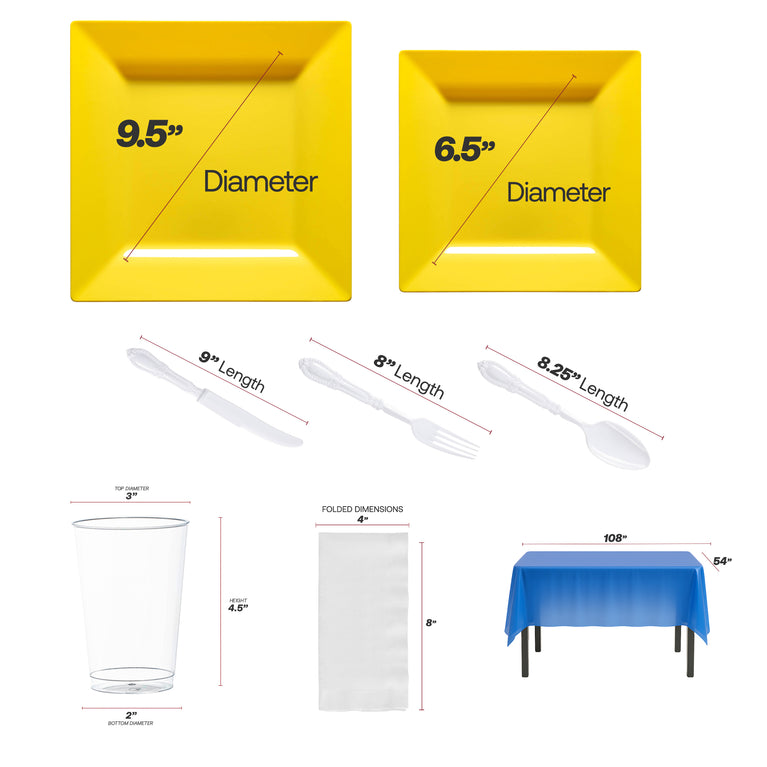 - Service for 20: 20 Dinner Plates, 20 Cake Plates, 20 Forks, 20 Spoons, 20 Knives, 4 Tablecloths, 50 Dinner Napkins and 20 Cups